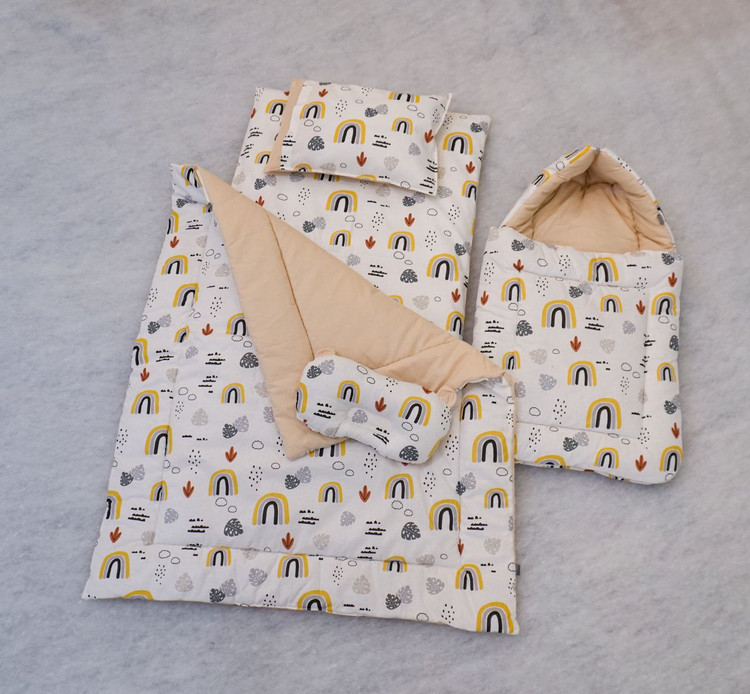 این سرویس خواب 5 تکه شامل : پتو، بالشت، تشک، قنداق فرنگی و بالشت فرم دهی و کاور حمل است.