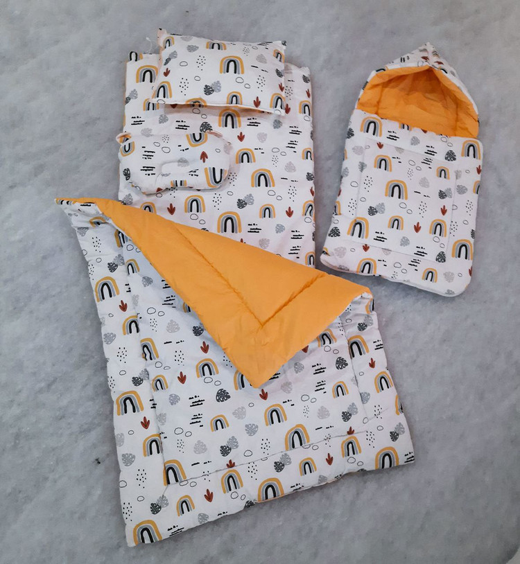 این سرویس خواب 5 تکه شامل : پتو، بالشت، تشک، قنداق فرنگی و بالشت فرم دهی و کاور حمل است.